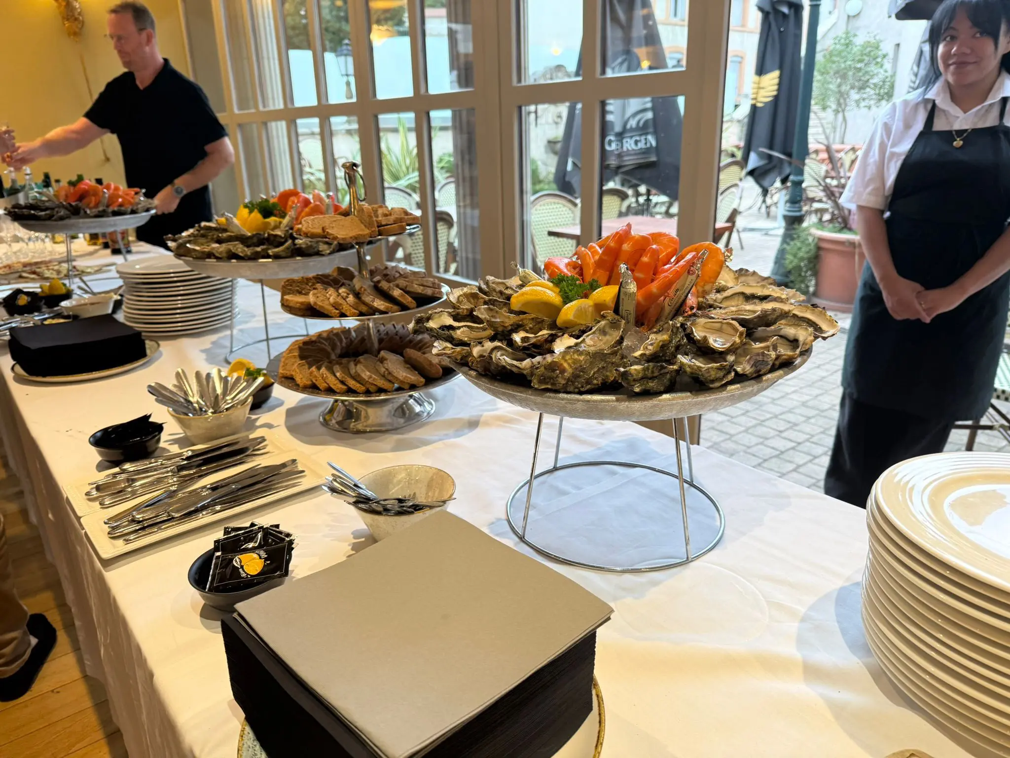 Les fruits de mer sont prêts à déguster, servis avec citron, mayonnaise, aïoli, vinaigre à l’échalote, beurre et pain de seigle.